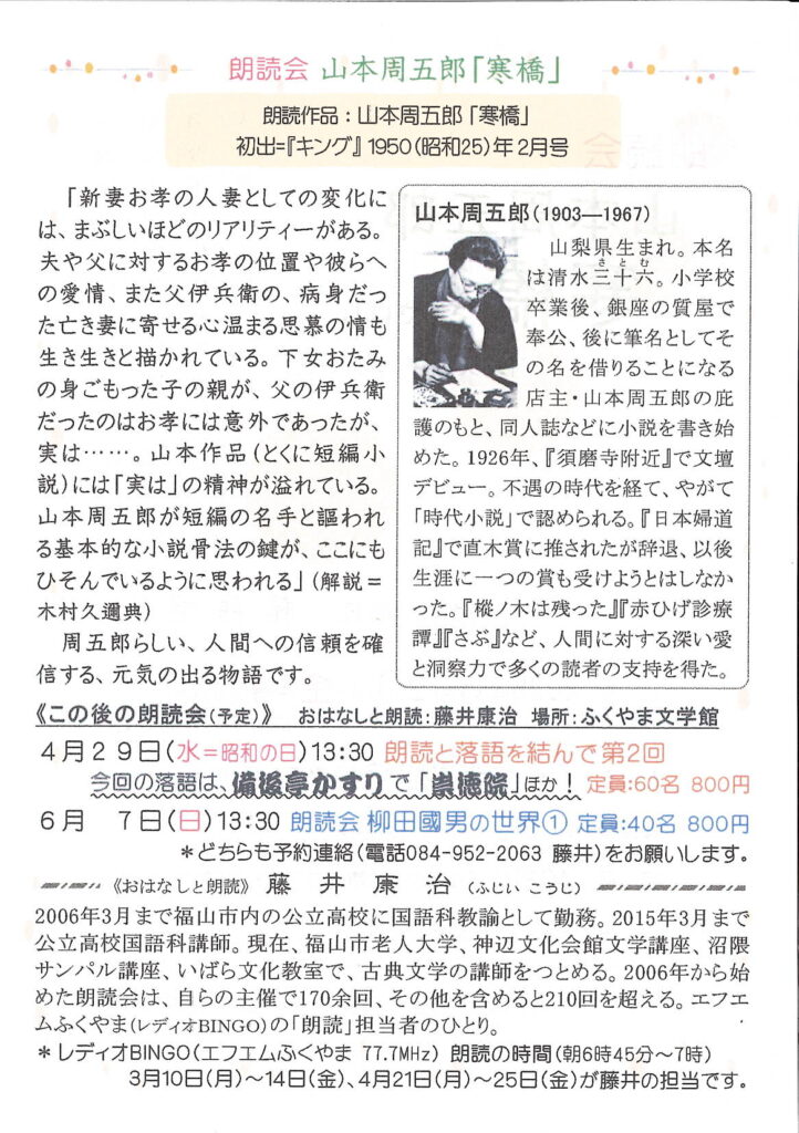 朗読会 山本周五郎 寒橋