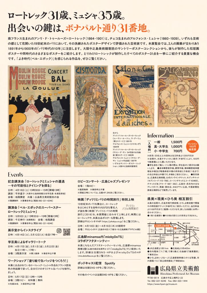 アンリ・ド・トゥールーズ=ロートレック(1864-1901)と、アルフォンス・ミュシャ(1860-1939)は、いずれも19世紀末のパリで活躍した芸術家。本展では2人の画業が交わる1891年から1900年の「パリ時代の10年」に注目し、「よき時代(ベル・エポック)」を感じられるポスターなどをご紹介します。