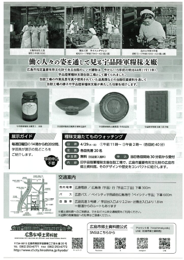 広島市有形文化財に指定され、今年開館40年目を迎えた広島市郷土資料館の建物は、もとは明治44年(1911)に建てられた旧宇品陸軍糧秣支廠(きゅううじなりくぐんりょうまつししょう)缶詰工場でした。 展示を通して缶詰工場の様子や宇品陸軍糧秣支廠が果たした役割を紹介します。