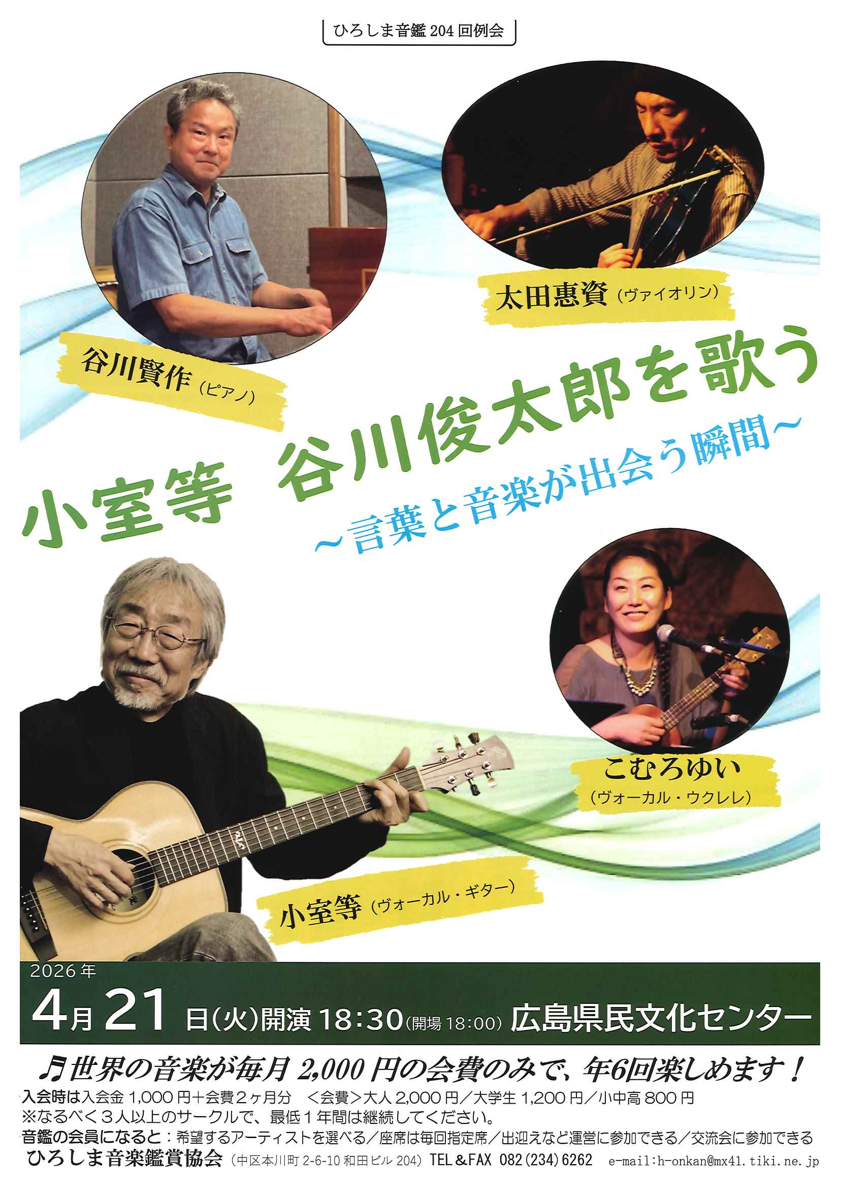 ひろしま音鑑204回例会 小室等 谷川俊太郎を歌う~言葉と音楽が出会う瞬間~