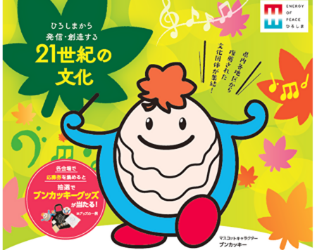 けんみん文化祭ひろしま・分野別フェスティバル 毎年秋になると、県内のあちこちで、マスコットキャラクター「ブンカッキー」が目を引く、けんみん文化祭のチラシが登場します。長年親しまれてきた光景です。